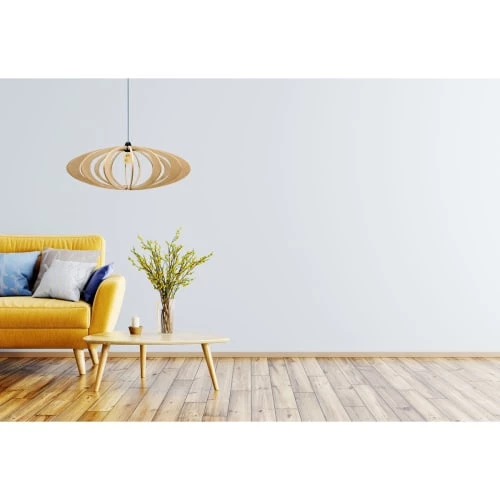 Abat jour : 100% MDF Douille : 100% Bakelite (résine thermodurcissable, matériau léger et durable)Câble : fil électrique recouvert de lin pour un rendu plus esthétiqueRosace plafond : en bois brut non traité (livrée avec un crochet et deux chevilles avec les vis pour la fixation au plafond, un système de blocage du câble à l’intérieur de la rosace.)